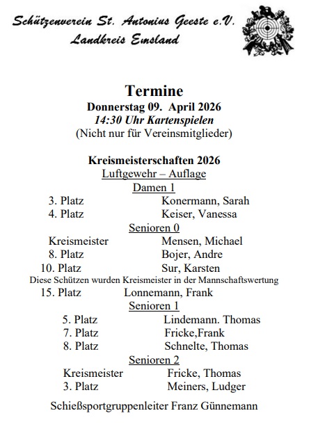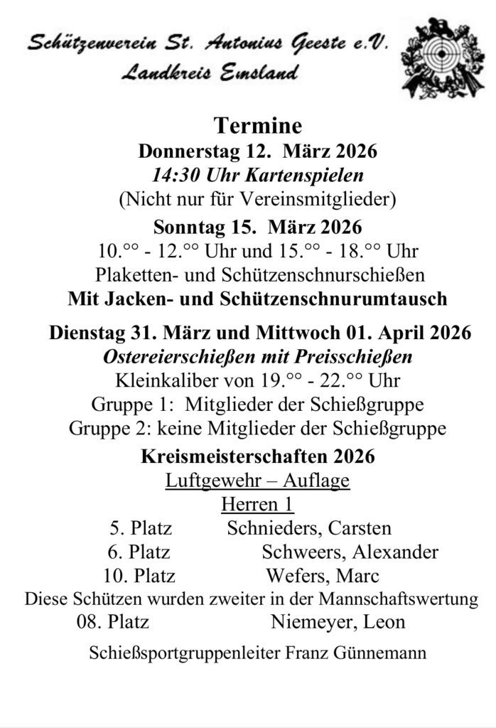 Wir freuen uns, dir auf den nachfolgenden Seiten alles über den Schützenverein St. Antonius Geeste zeigen und viele Informationen geben zu können.