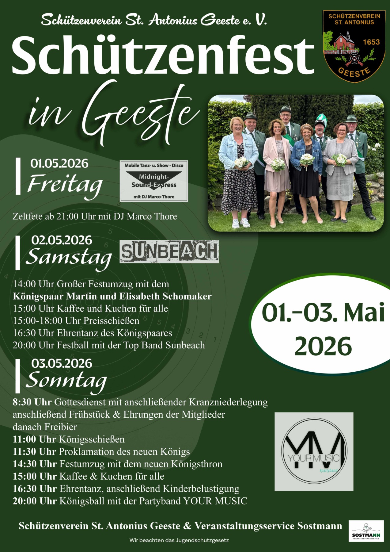 Vom 01. bis 03. Mai steht alles im Zeichen von Tradition, Gemeinschaft und guter Laune. Begleitet werden die Festtage von unserem Königspaar Elisabeth und Martin Schomaker sowie dem gesamten Throngefolge, die unserem Fest einen ganz besonderen Glanz verleihen.